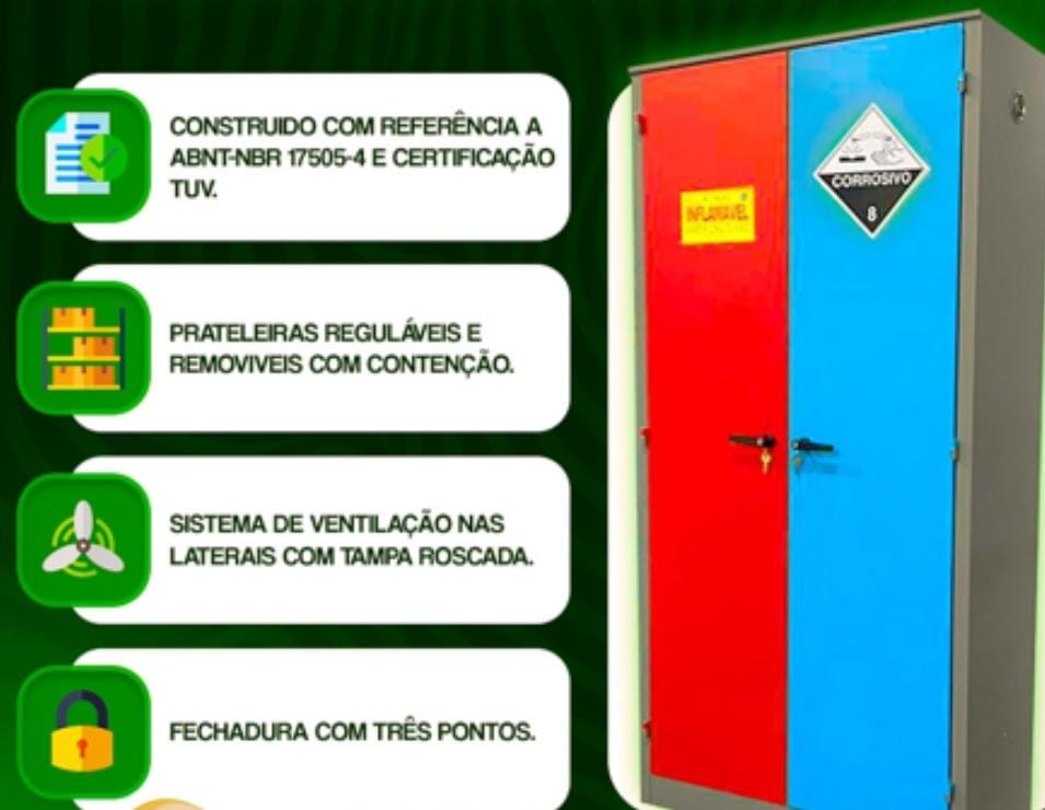 Armário destinado ao armazenamento isolado de recipientes contendo Líquidos inflamáveis e combustíveis, Ácidos e agentes corrosivos;